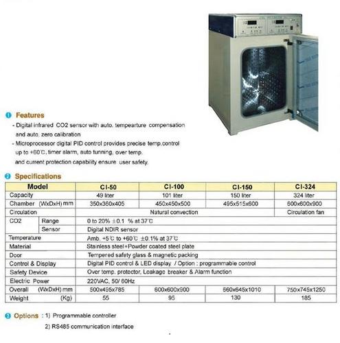 Offering Co2 Incubator: Digital Infra Red Co2 Sensor with auto temperature compensation and auto zero calibrationMicroprocessor PID controllersTemp Range 5 deg to 60 degCo2- 0-20% |